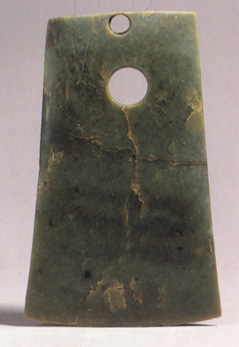双孔玉斧 高 17.7 厘米 ,刃宽 10.9 厘米 ,福泉山遗址出土。礼器。玉色青绿,间有灰黄和黑褐色斑痕。扁平梯形,刃部微弧,略向外翘,并磨出刃口。上部中间有大小二个圆孔,大孔单面管钻,小孔两面对钻,孔内留有对钻痕迹。玉斧的一面有两道弧形制作痕迹。玉斧由石斧发展而来,在新石器时代早中期,石斧是常用的生产工具,有时兼作战斗武器,到良渚文化时期,人们把大件玉石加工成玉斧,因此,玉斧演变成为部落首领的财富和权利的象征。